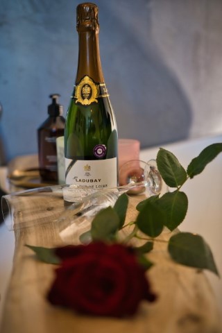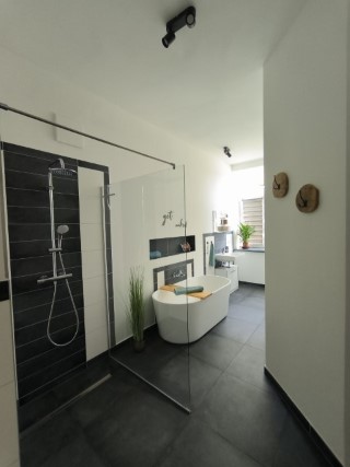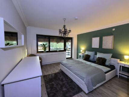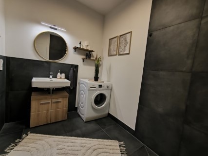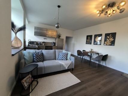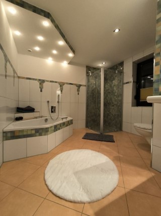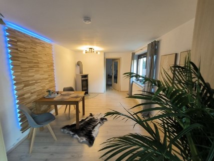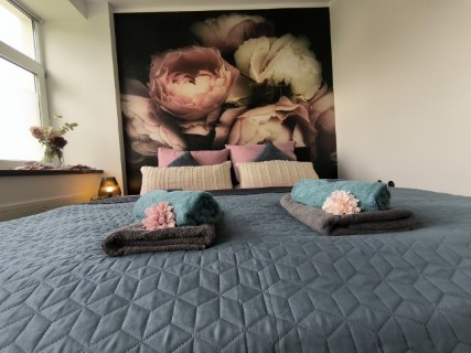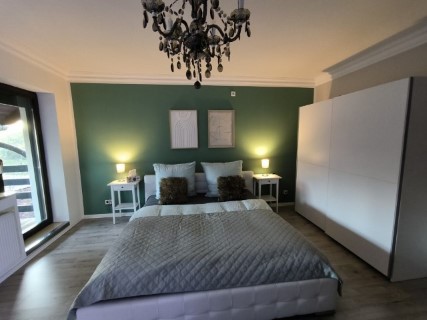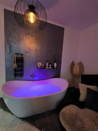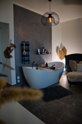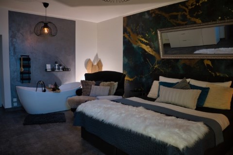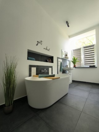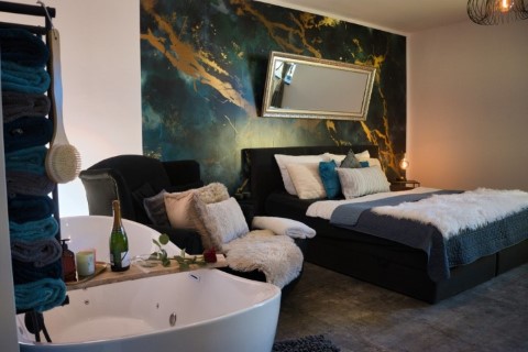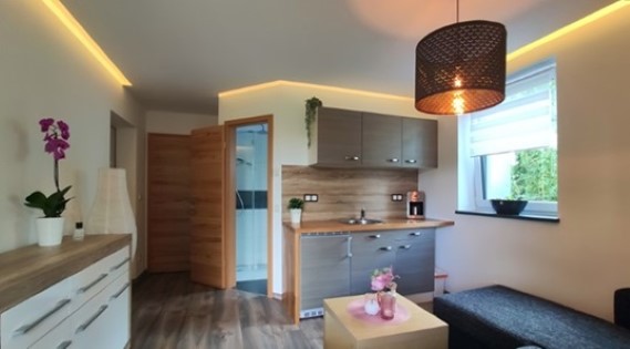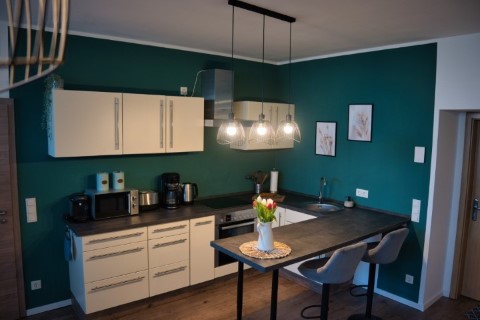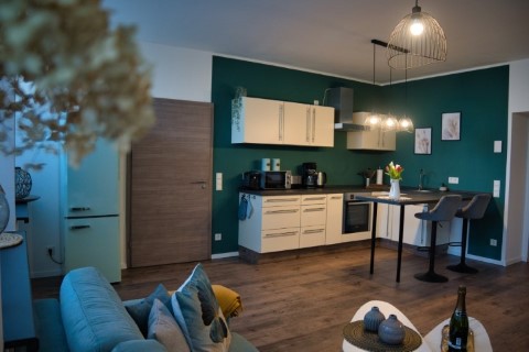 Auf 40qm befindet sich eine Wohnküche, ein Schlafzimmer mit 180cm Boxspringbett und einem Whirlpool und ein Bad mit Dusche und Waschmaschine.