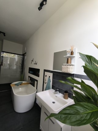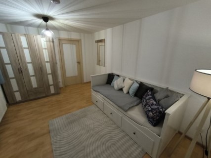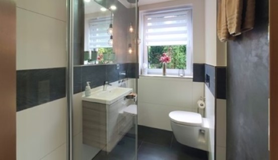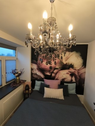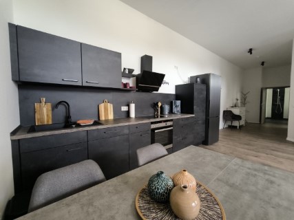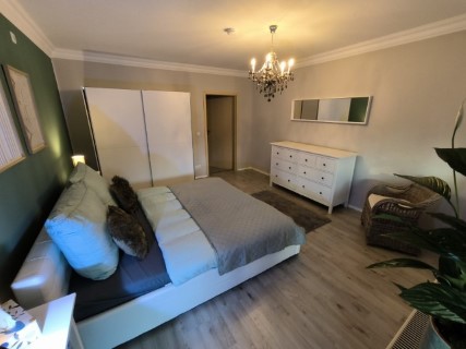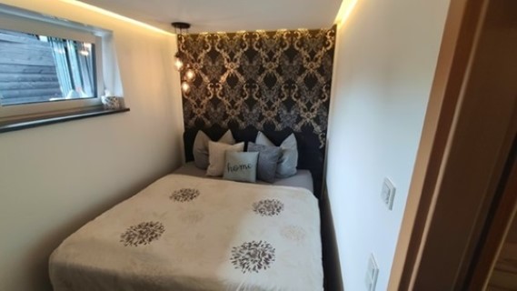 Auf 40qm befindet sich eine Wohnküche, ein Schlafzimmer mit 180cm Boxspringbett und ein Bad mit Dusche und Waschmaschine.