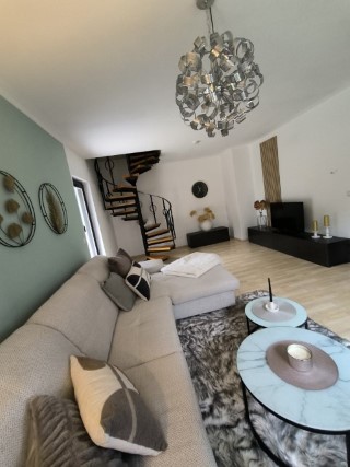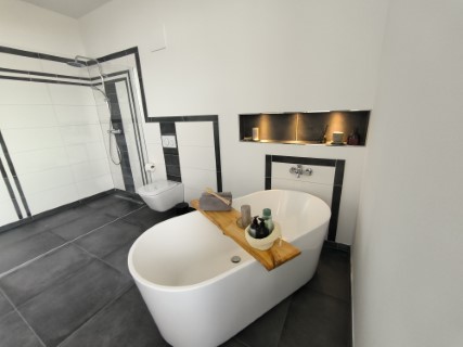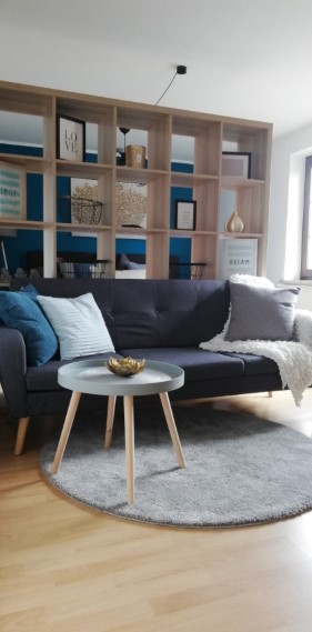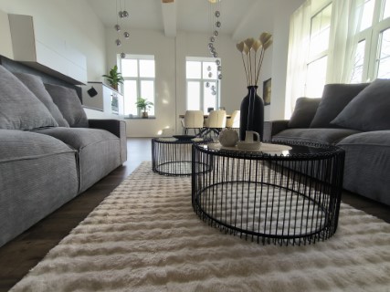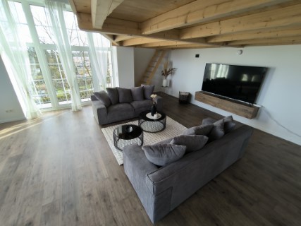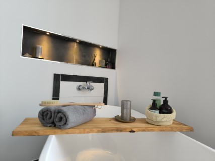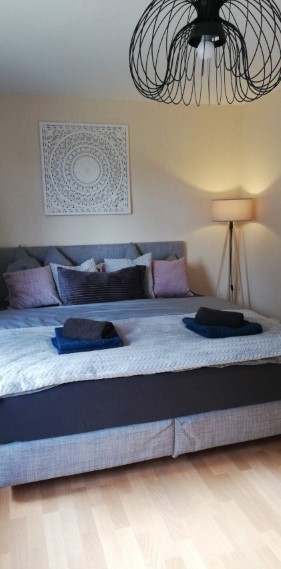 Auf 50qm befindet sich eine Wohnküche, zwei Schlafzimmer mit 180cm Boxspringbett und 160cm Doppelbett und ein Bad mit Dusche und freistehender Badewanne und Waschmaschine.